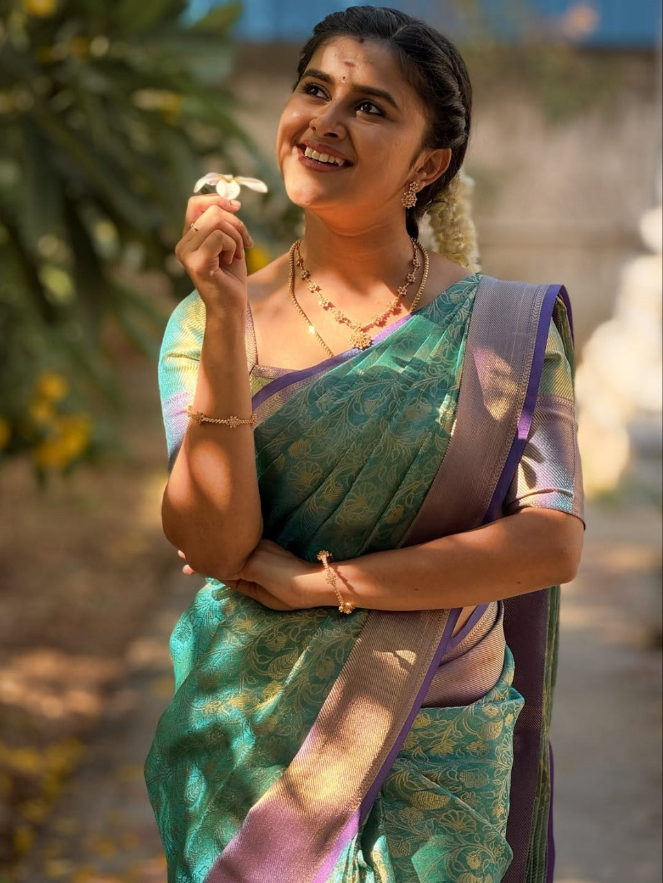 Premium Soft Banarasi Silk Saree – Peacock Green With Dual Tone Metallic Border