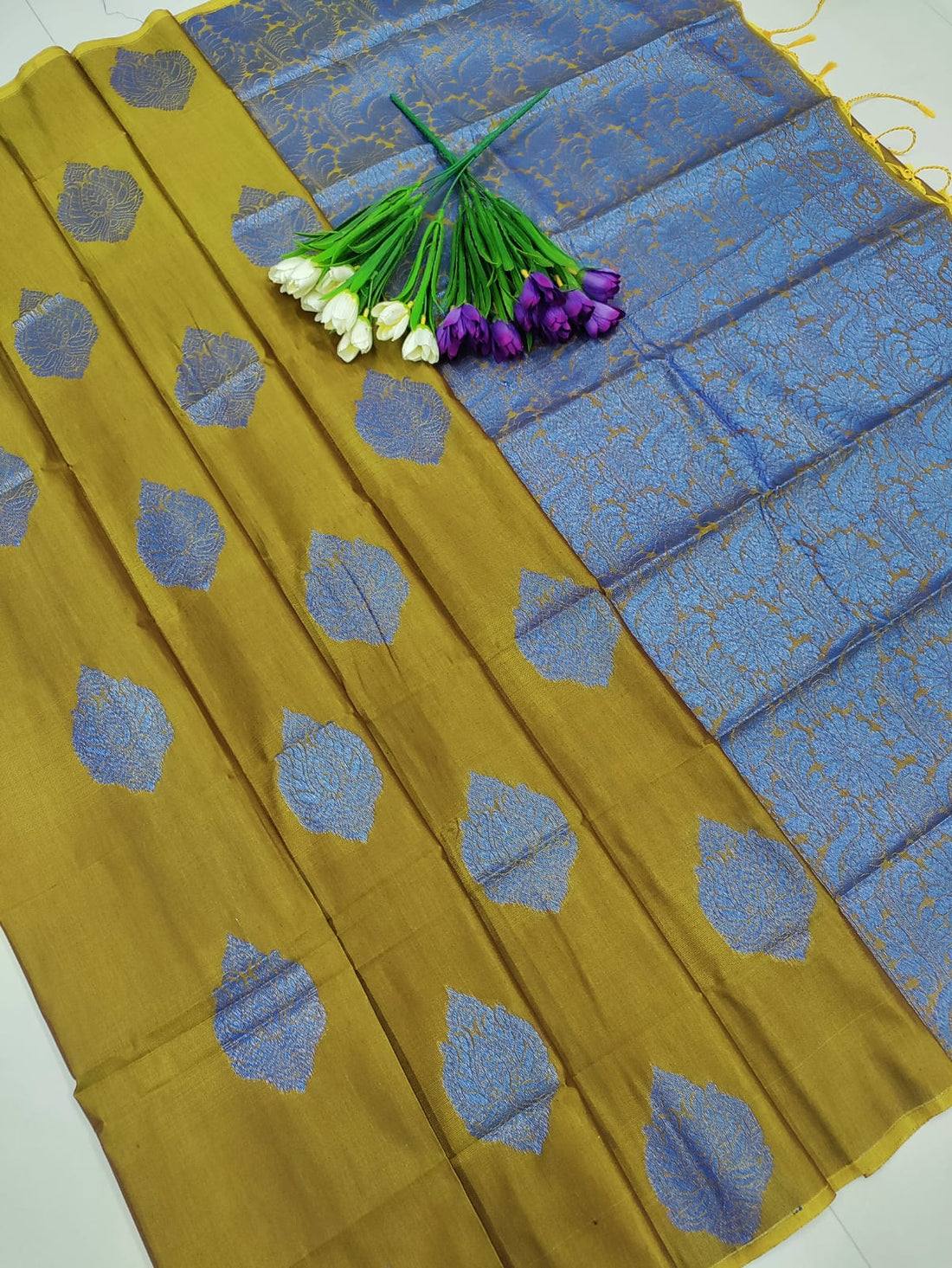 Step into elegance with this Cool Cotton Dual Shade Saree, featuring a striking mustard yellow...