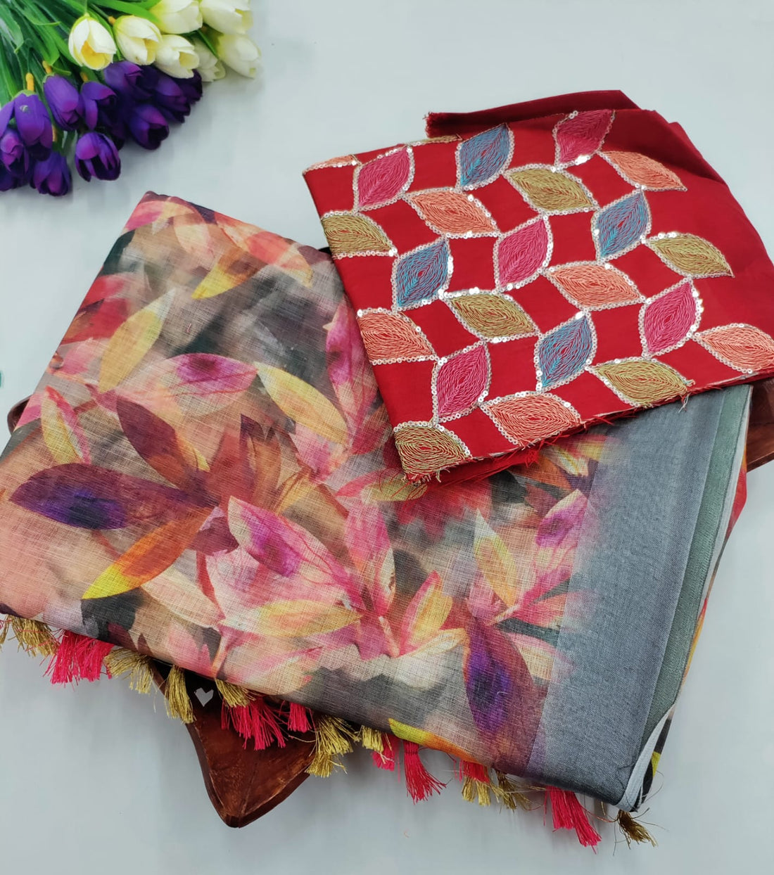 Elevate your collection with this Linen Cotton Saree paired with a beautifully crafted sequins embroidery...