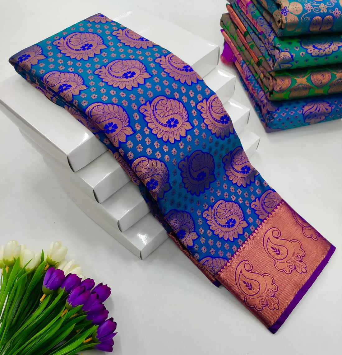 Drape yourself in elegance with this stunning Mysore Silk Saree in a vibrant peacock blue...