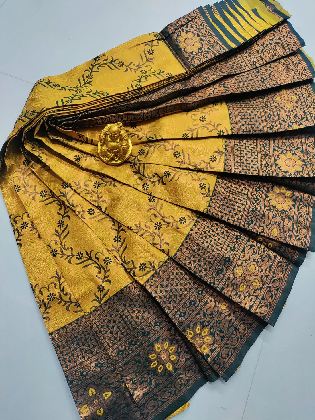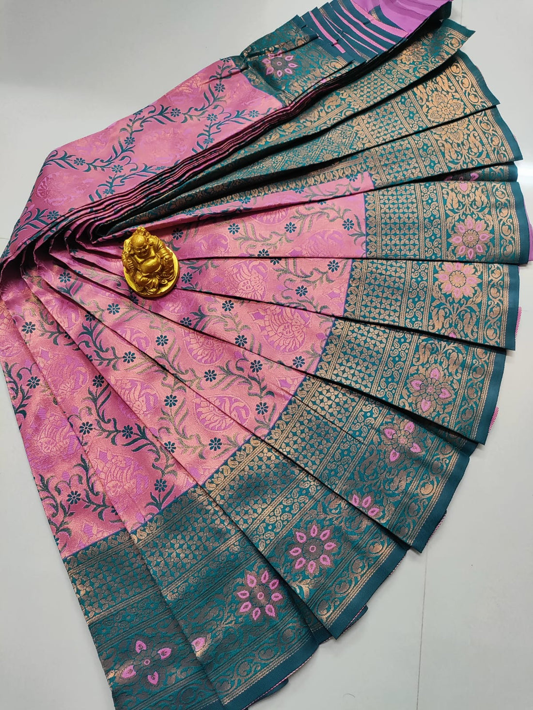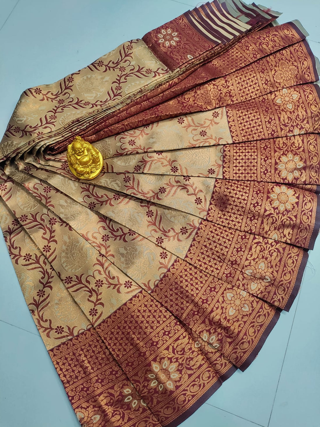 Elegant Banarasi soft silk saree with rich zari floral weaving and contrast border. Perfect for...