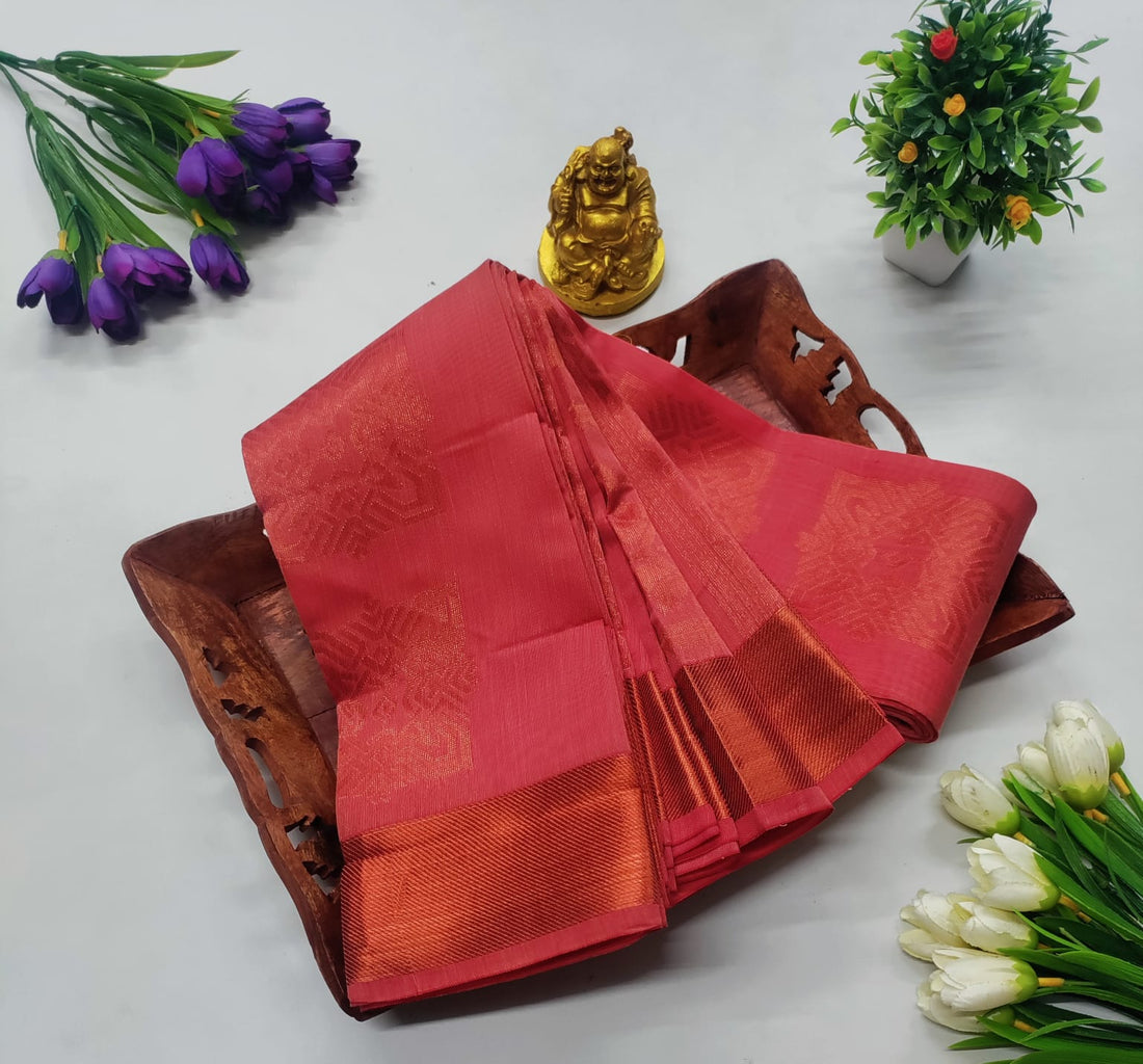 Radiate grace and charm with this stunning Rose Gold Tissue Silk Saree, crafted for women...