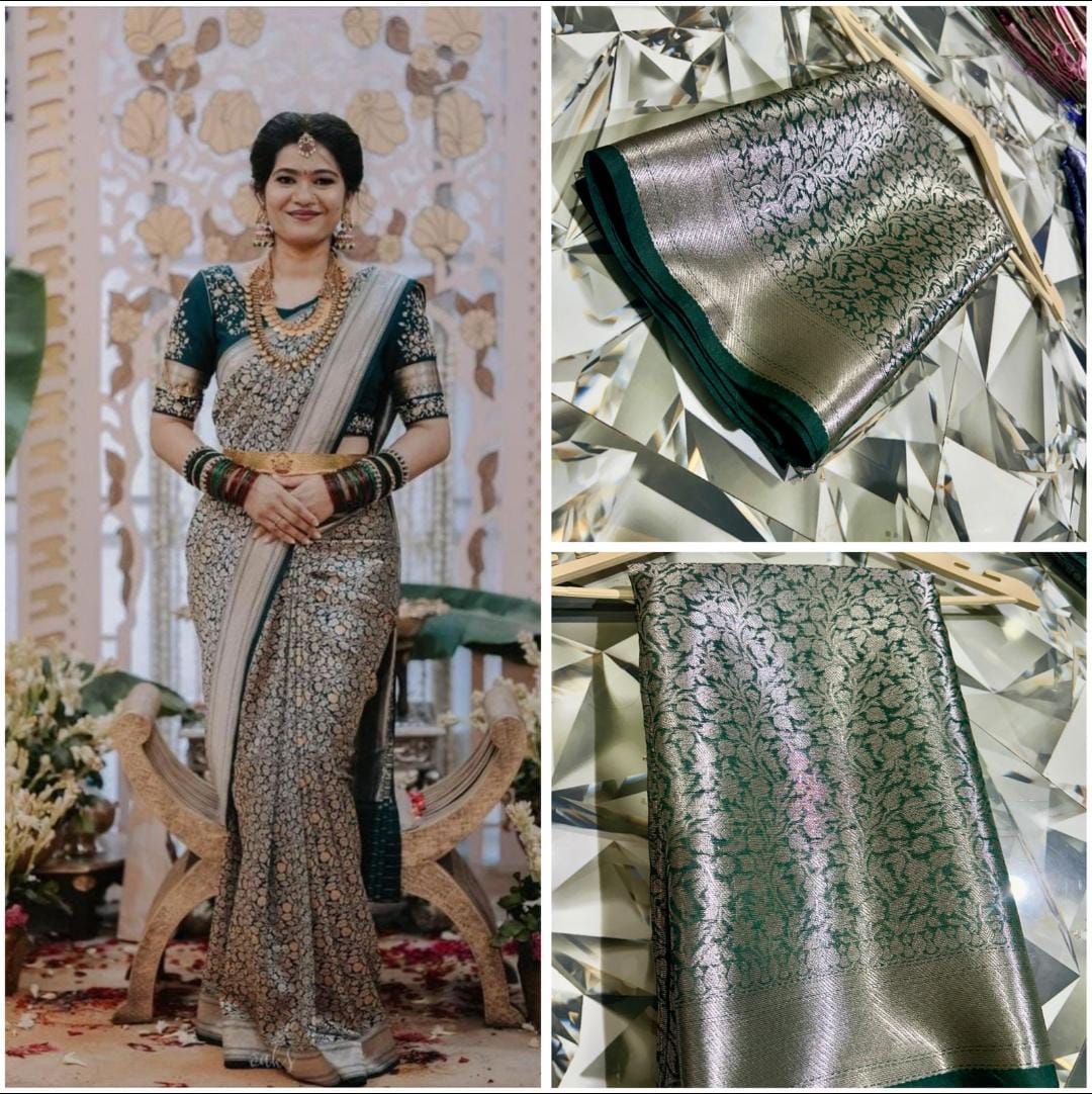 Radiate elegance with our Green Kataan silk Saree, a perfect combination of tradition and luxury. Woven from premium tissue fabric, this saree features intricate golden zari work that highlights the rich heritage of Varanasi craftsmanship, making it an ideal choice for weddings, receptions, and festive occasions.